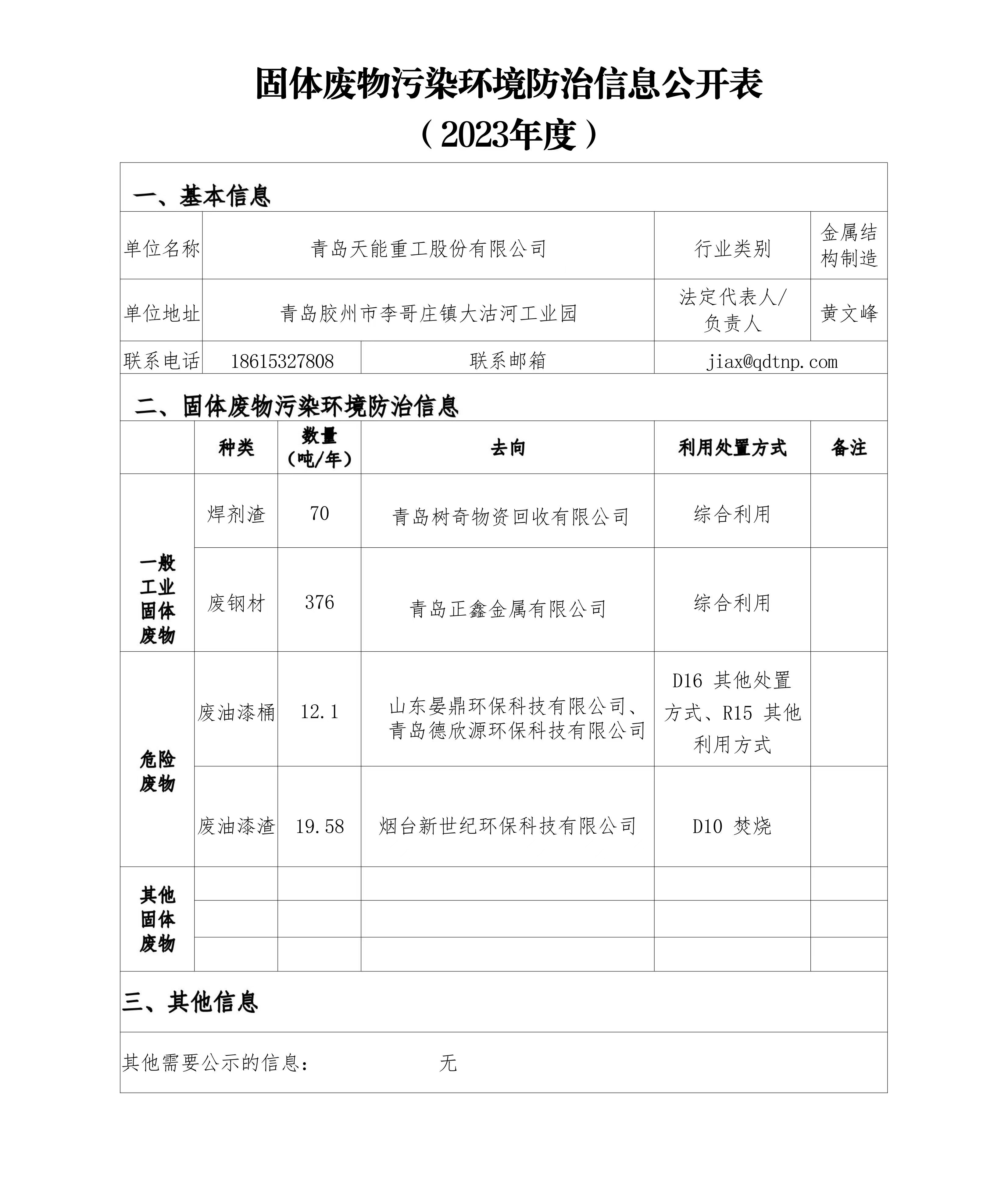固体废物污染环境防治信息公开表 (2023年度)