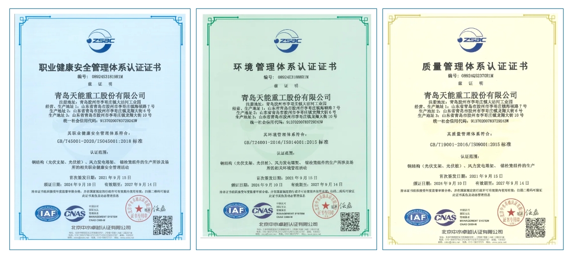 审核过程中,评审专家仔细检查包括体系运行管理制度文件、实施证据记录、产品生命周期质量控制、安全生产隐患排查治理措施、安全管理投入明细、危废处置、员工职业健康状况评估报告以及风险识别与防控策略等一系列关键资料,并对锚栓笼基础、光伏平台、光伏桩和风电塔筒生产现场进行实地考察。