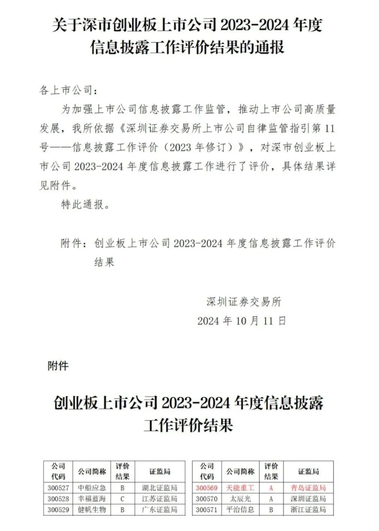 根据深圳证券交易所公布的数据,本次参加深市信息披露评价考核的创业板上市公司共1327家,被评为A级的上市公司共201家,占比仅15.15%。此外,青岛辖区33家深市上市公司中仅有4家获信息披露A级评价,公司信息披露工作在青岛辖区深市上市公司中表现突出。